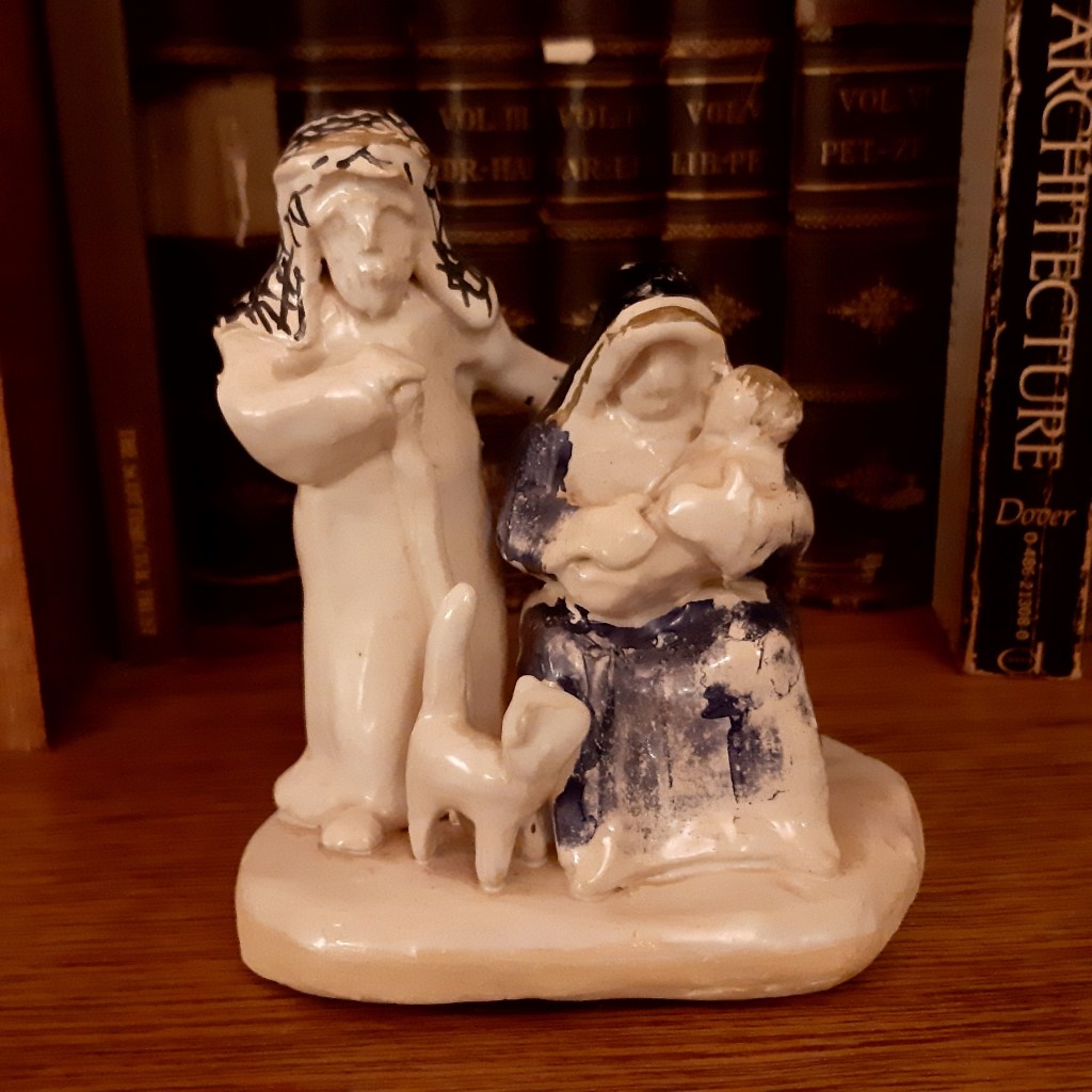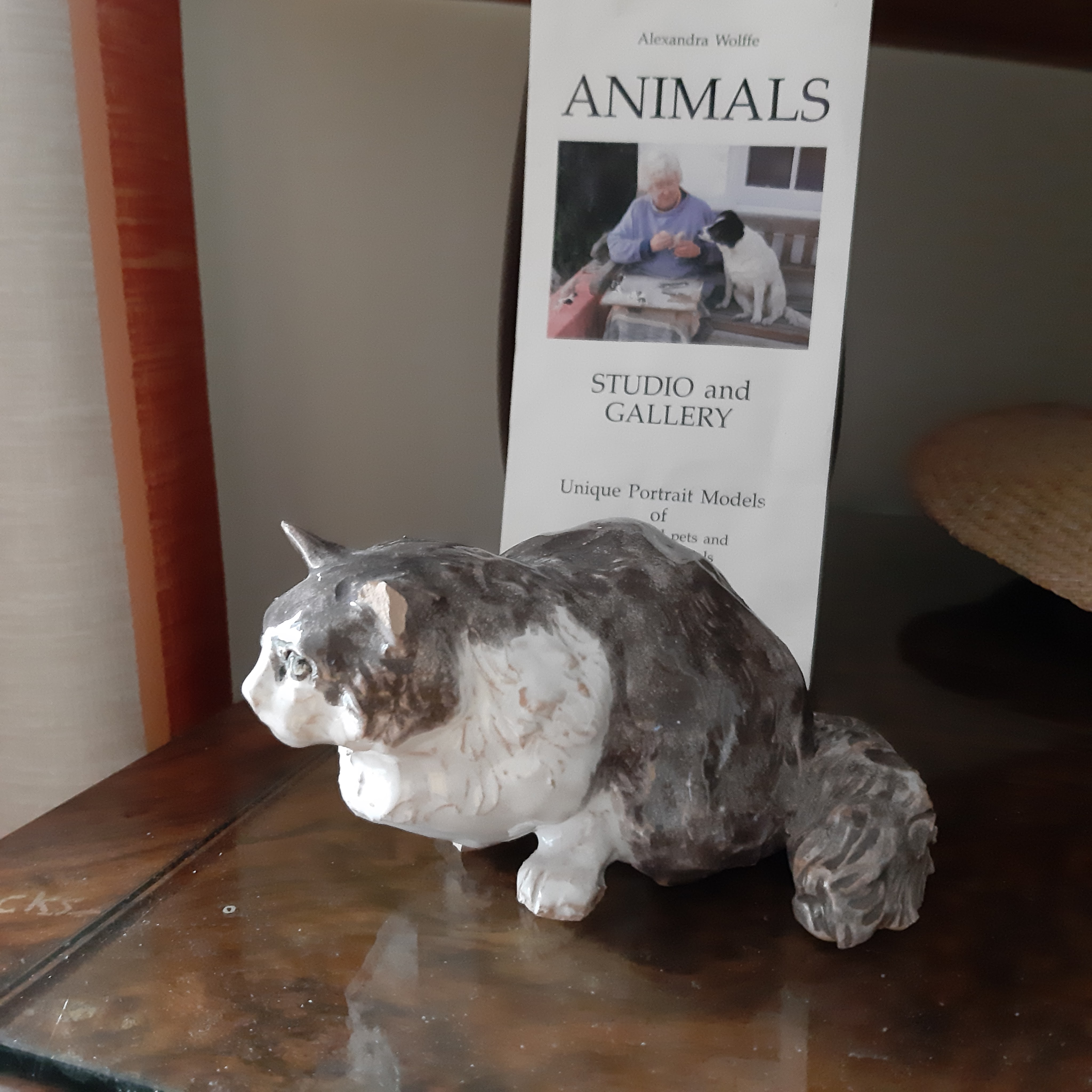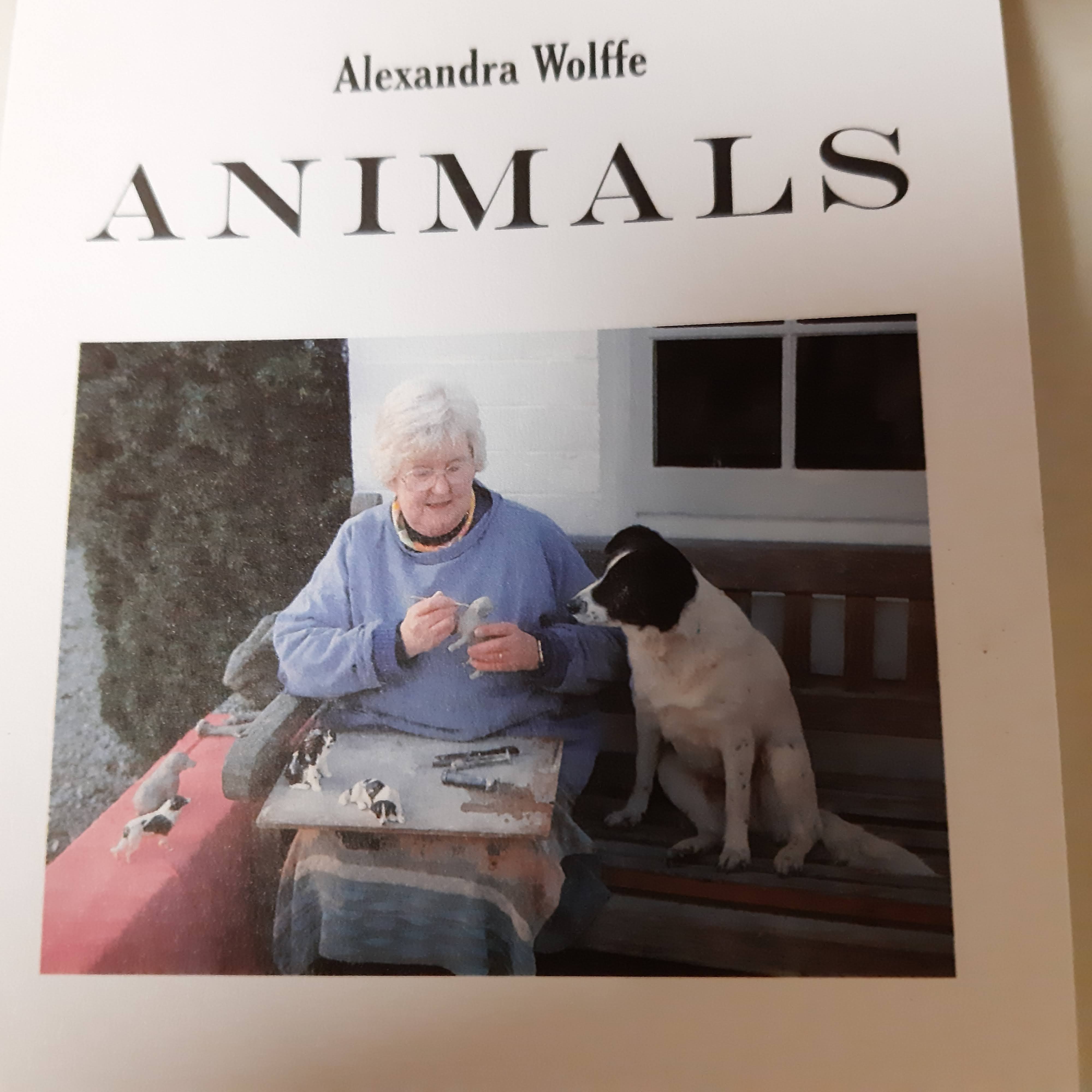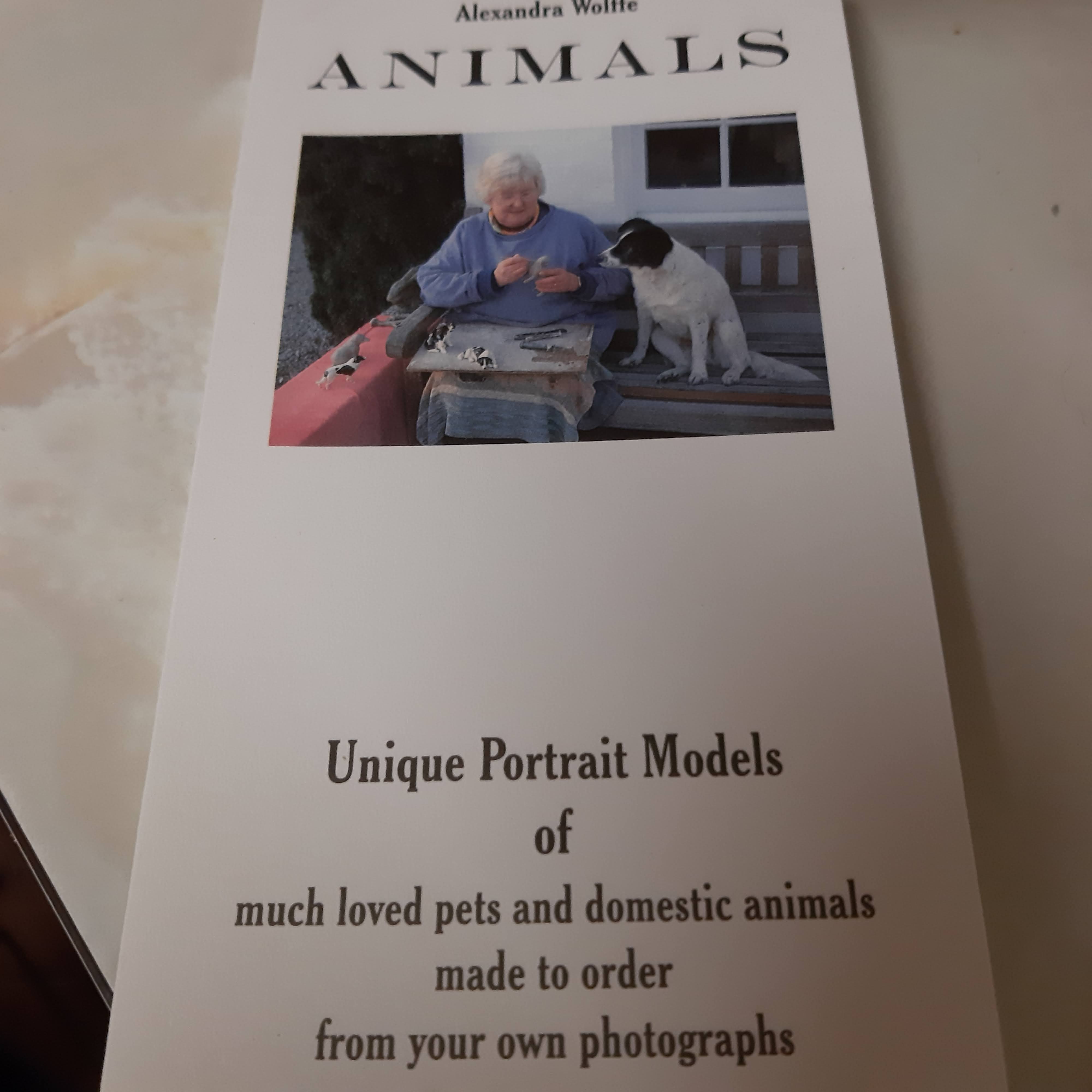 When my brothers and I had left home, mum took up her art more seriously again. She attended pottery classes locally and when she couldn’t get on to the wheel, she started sculpting with her clay. Of course she was drawn to animals (you’ve seen some of her sketches) and before long she was commissioned to create a prize bull from a photo. And her business was born… she created ceramic models of animals, and sent them all over the world. This was before social media, so she traveled to craft fairs and agricultural shows to promote her wares. And she had an old school leaflet, featuring this lovely picture of her with her wee dog, Mouse. (And wearing a fisherman’s smock!)