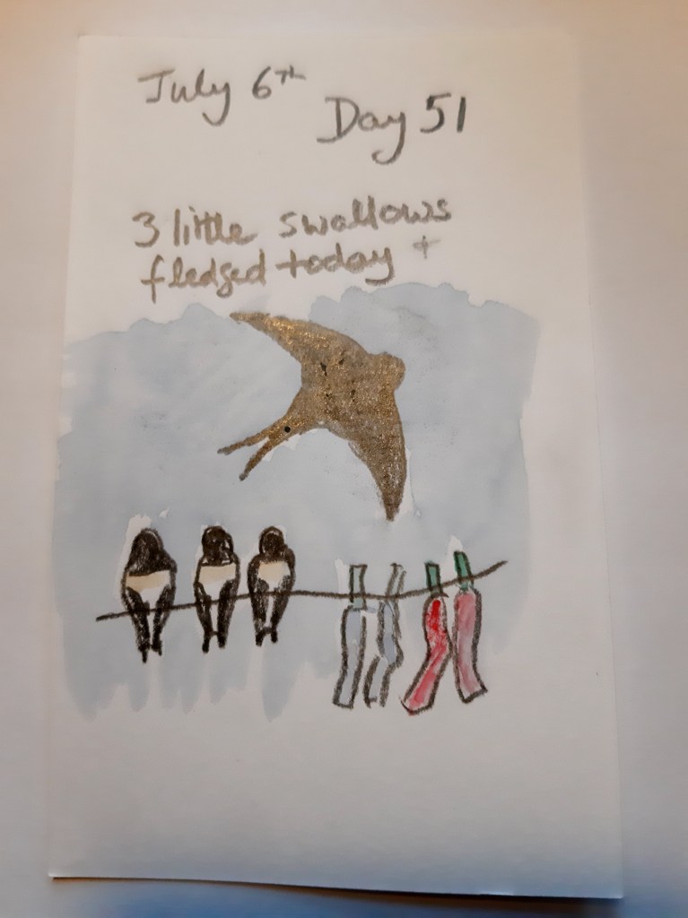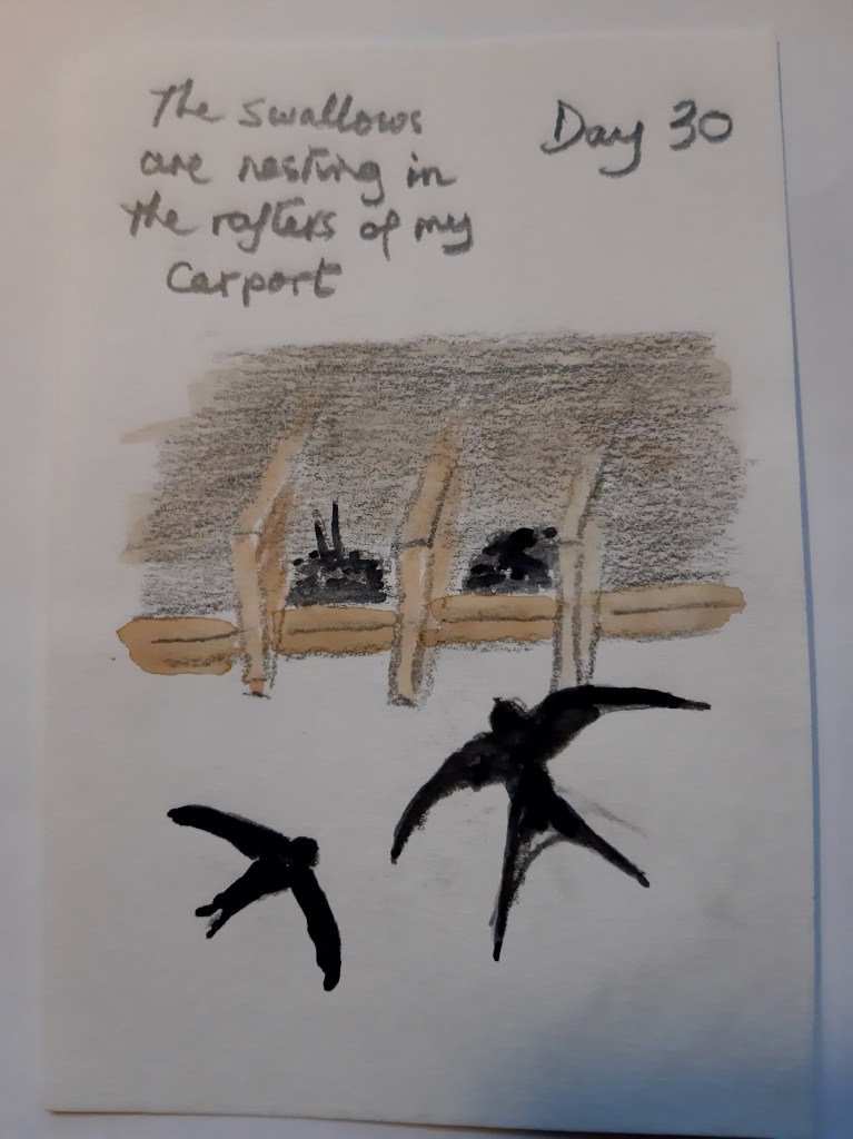 Mum never drafted the design for me, she’d given up drawing. We now realise that she was already coping with dementia and I guess her brain could no longer put the images on paper in a way that would satisfy her. The design was created by my nephew, Max, when he was last visiting and the swallows were feeding their babies.