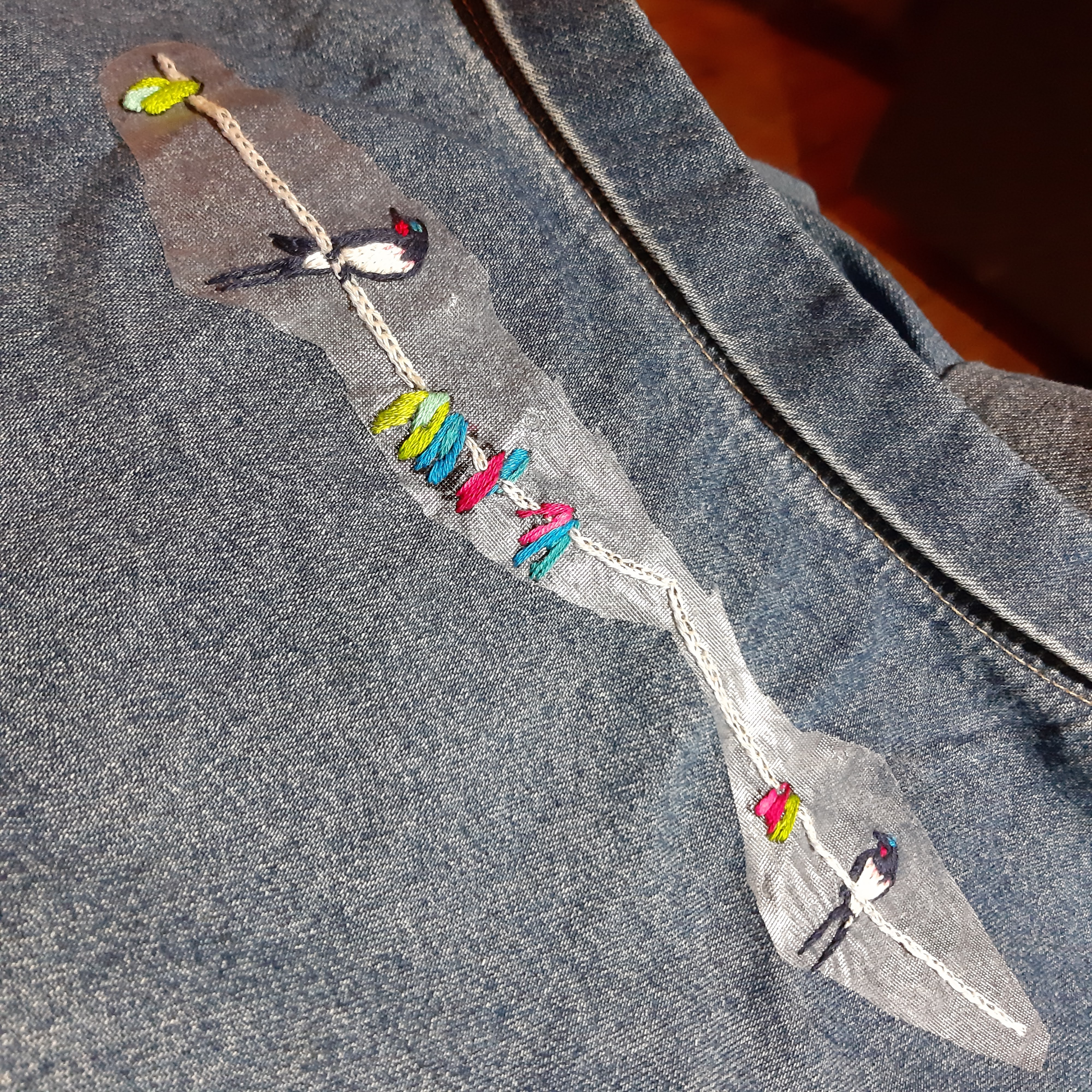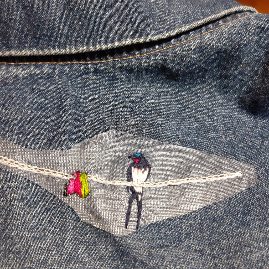 Did you think my wee swallows were finished in that last post? Well no! The one on the left needed a few wee extra stitches on his head… but now they are done and you see them in all their glory!