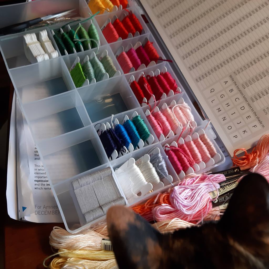 And today my embroidery threads organiser box arrived so I’ve started sorting it out whilst in meetings, under MisoCat’s supervision, obviously.