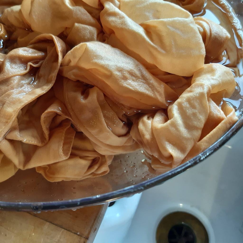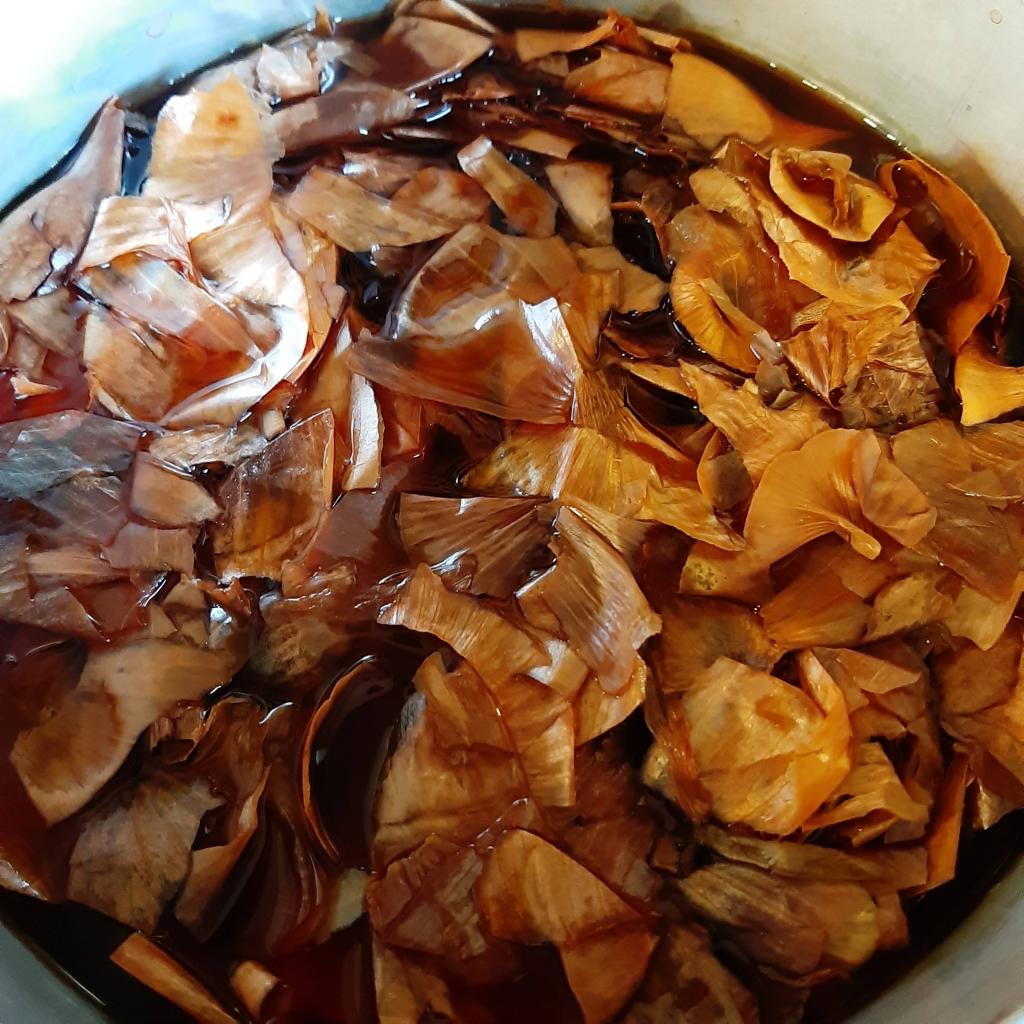 Yesterday I used about a year’s supply of discarded (but saved) onion skins to dye a white shirt. I am now the owner of a shirt that looks like it’s been dipped in builder’s tea. And then you’ve dribbled more stronger tea here and there.