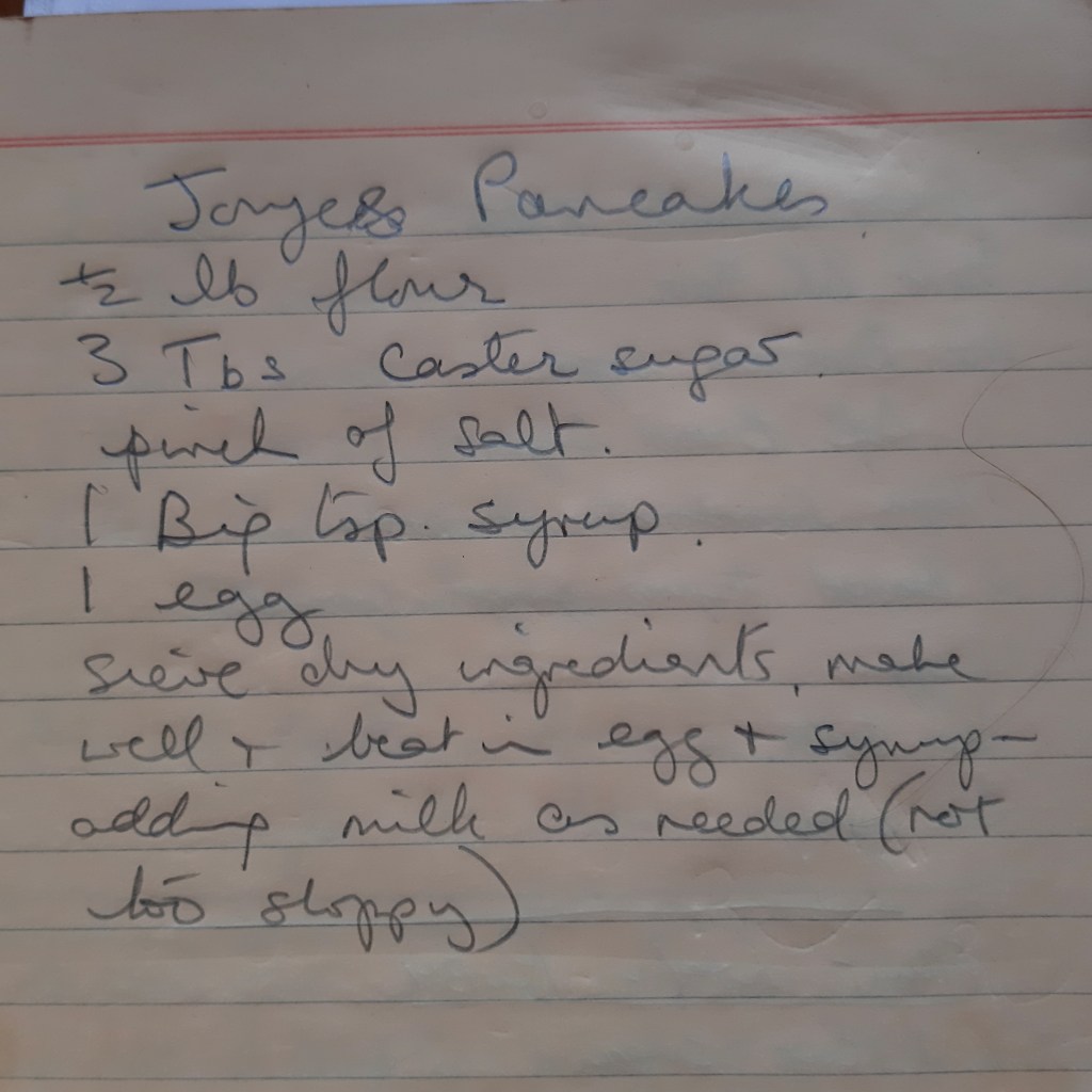 We have Joyce’s pancake recipe in Mum’s recipe book.. the instructions aren’t today’s cookbook standard, but you can probably work it out, if you know what you’re looking for.
