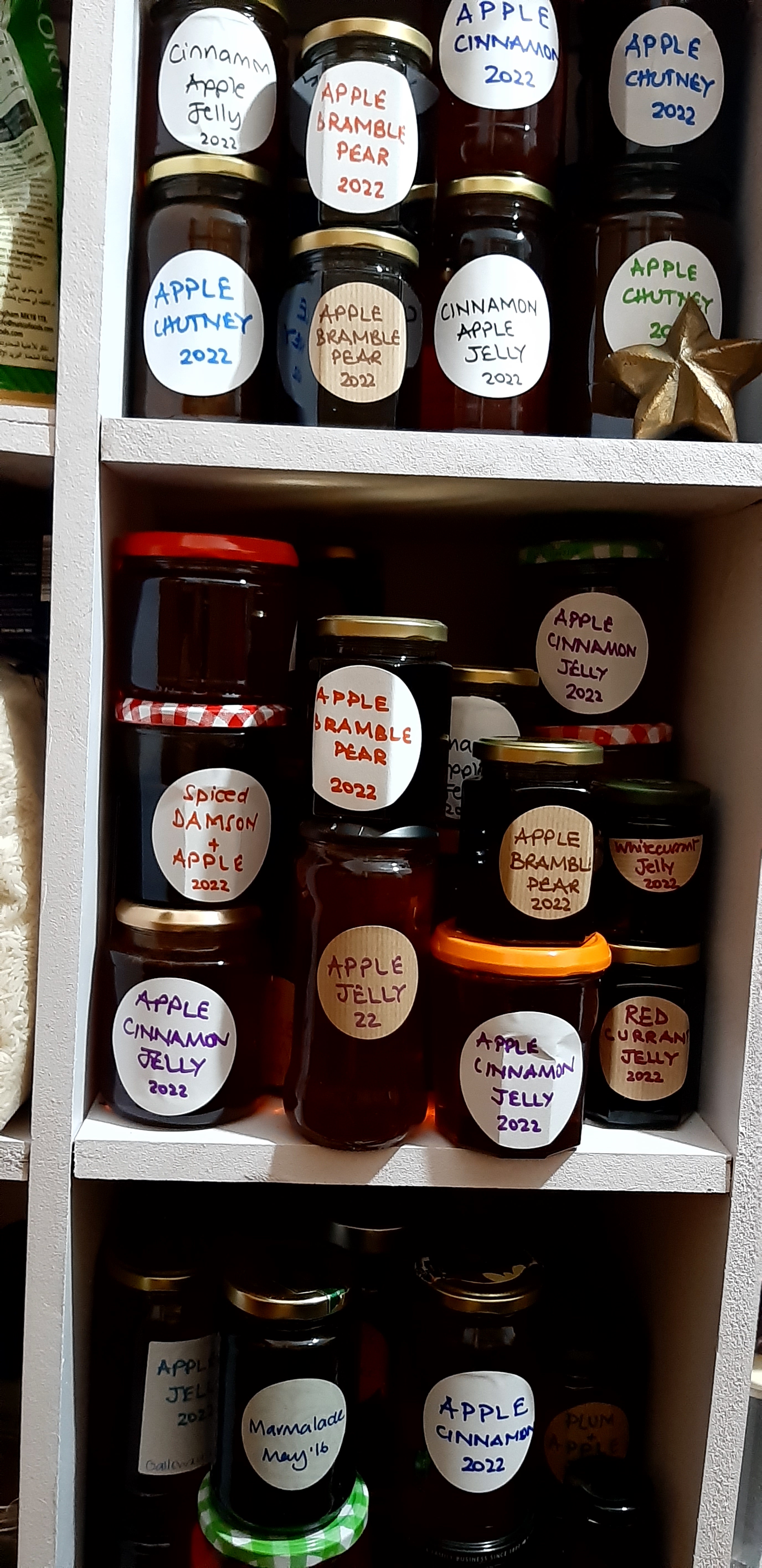 On the shelves under the stairs we always had a selection of jars of dodgy brownish-green goop, usually with a small label identifying what kind of chutney it was, with the month and year it was made (in my experience it was always some years ago). Mum’s shelves till contained many of these jars – did she just not eat chutney until it was vintage? Or did she have a chutney amnesty every 5 years when she’d throw out all the old ones? Anyway, I can’t be too rude about this trait as it is clearly inherited. You should see the boxes of jars of unidentifiable goop that has travelled to Galloway.