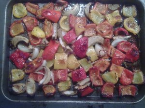 You’ll probably smell when it’s ready. Did it take about 45 minutes? I don’t really know. You don’t want crispy burnt bits, but you do want soft peppers and caramelised brown edges on some of the onions and peppers.